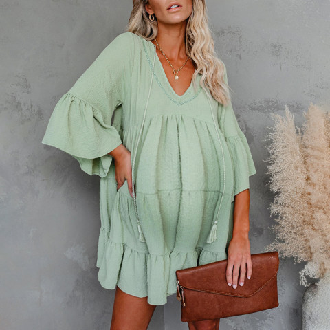 Maternity Cotton Ruffle Solid V-neck Beach Casual Dress